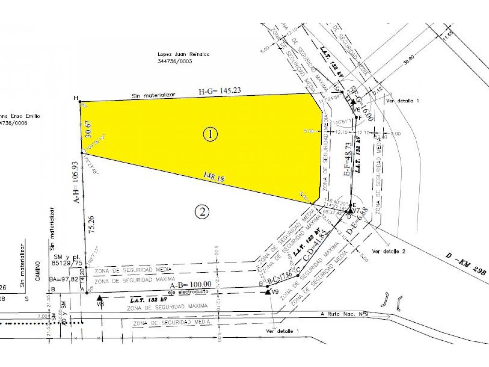 Medidas: 73 metros de frente sobre autopista, y tiene una superficie total de 7.494 m2. Su forma es irregular.
