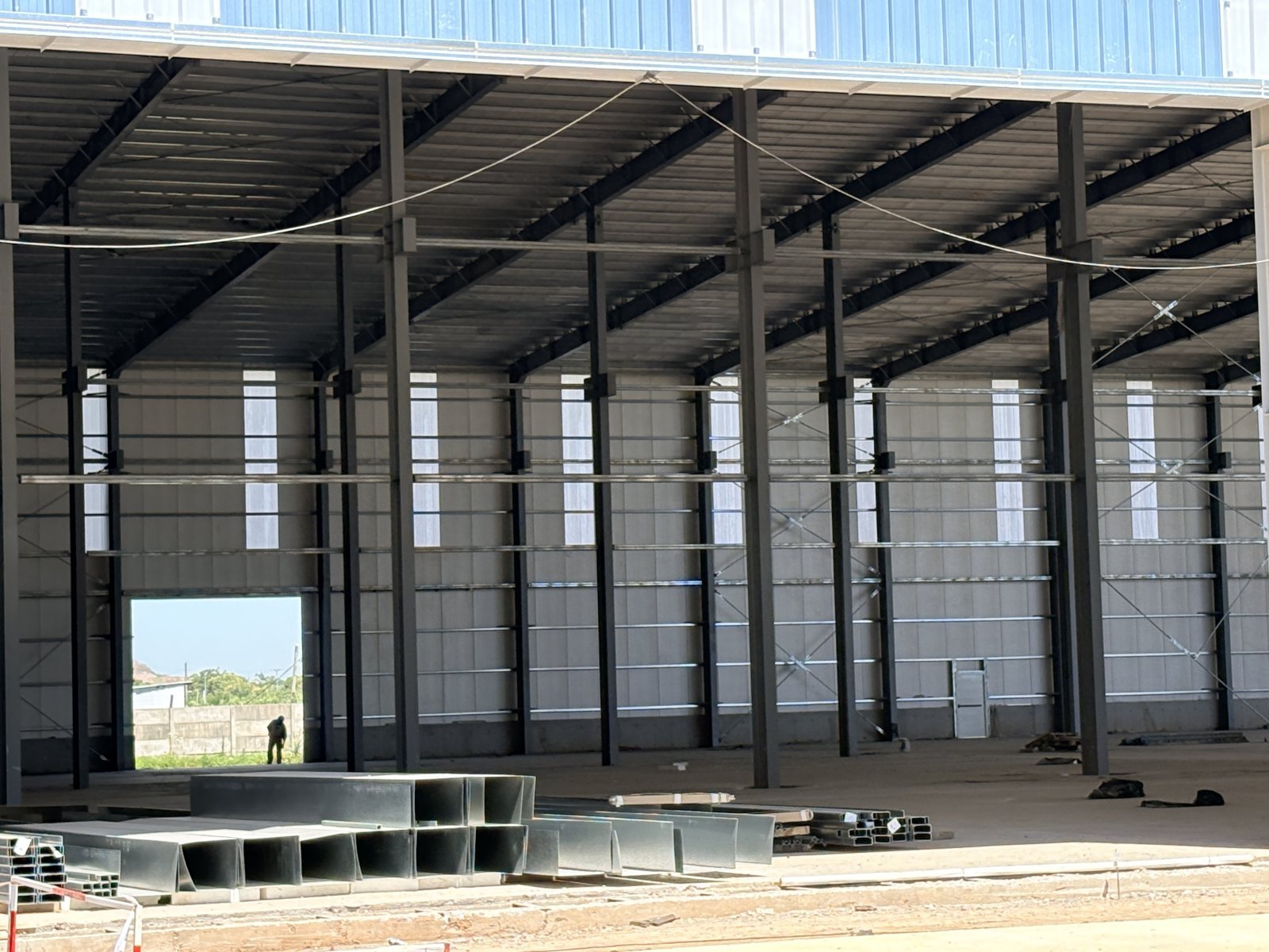 Estructura metálica: pórticos principales con perfiles tipo W, columnas de frontis y arriostramientos horizontales y verticales.