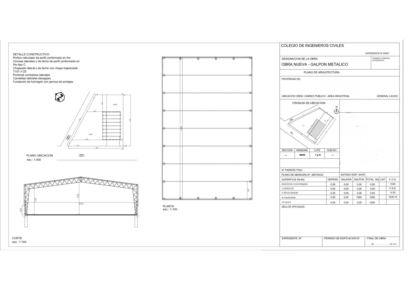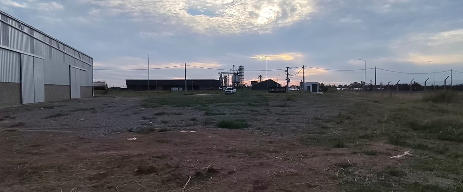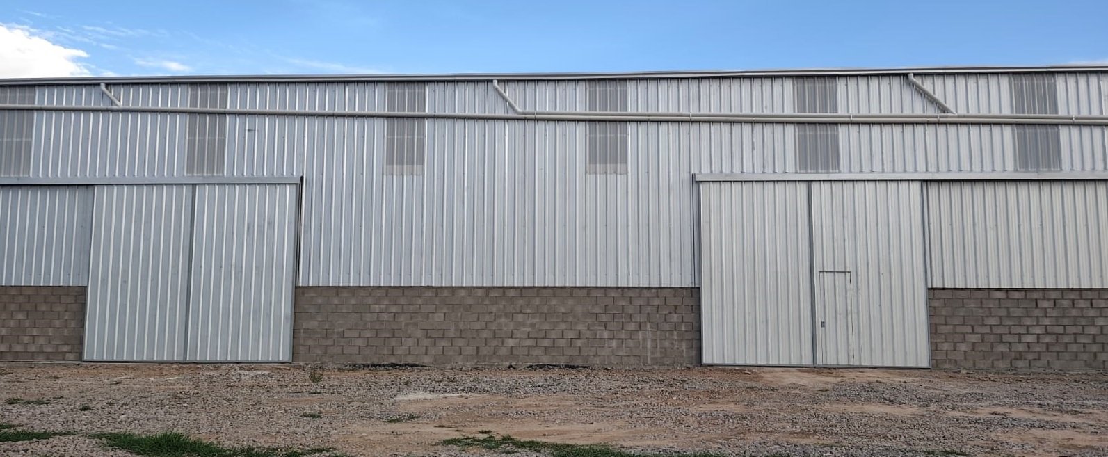 El ingreso al galpón se resuelve con 2 portones industriales de 5 x 5 m sobre el lado norte. El perímetro está totalmente cercado: muros premoldeados de hormigón de 2 m en lados sur y este, y tejido olímpico de 2 m con zócalo de material en norte y oeste. Piso de hormigón H25 fibrado de alta resistencia para trabajo intensivo ⚙️.