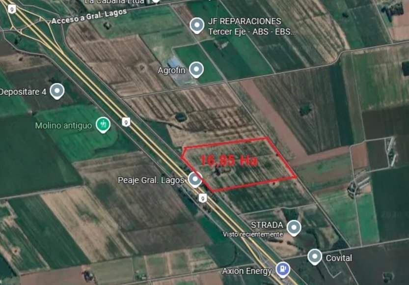 Lote industrial de 16,85 hectáreas 📐 con ubicación privilegiada frente al peaje de la autopista Rosario–Buenos Aires, sobre colectora Este mano a Rosario. Su visibilidad y accesos son inmejorables, ideales para potenciar la presencia de tu empresa y optimizar la logística 🚚.